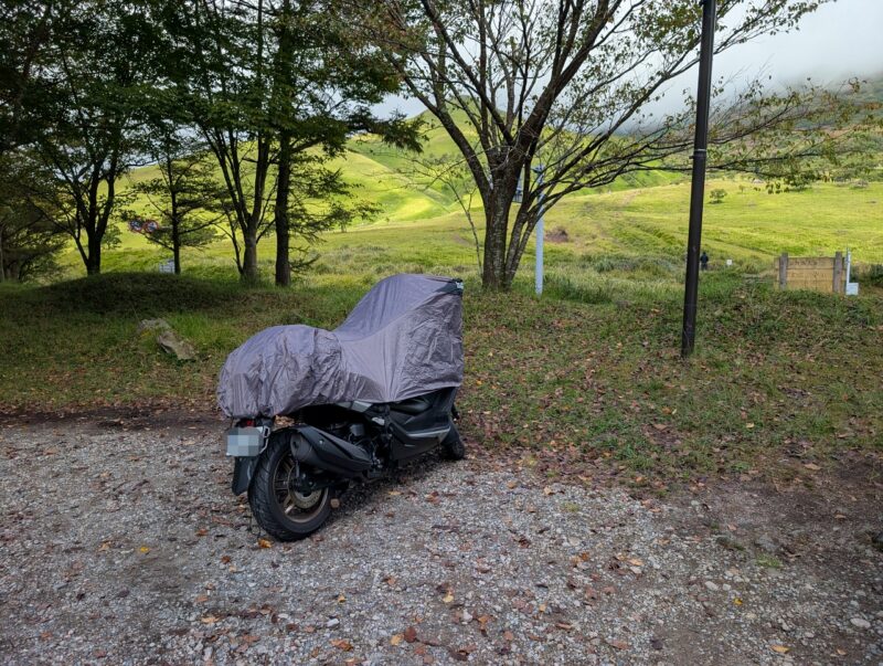 テンションだだ下がりで用意完了!シートに固定しているバックをそのままにしてシートカバーで隠します。こういう時にもハーフシートカバーは役立ちますね。