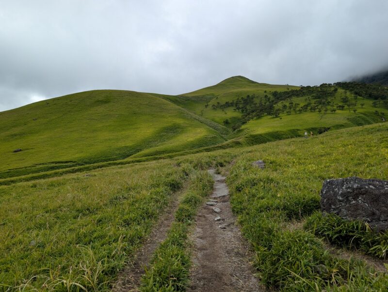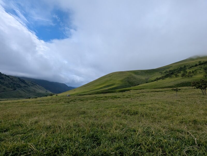 まずは傾斜のゆるい草原の中を気持ちよく歩いて行きます。左を見ると青空も時々見えてます。