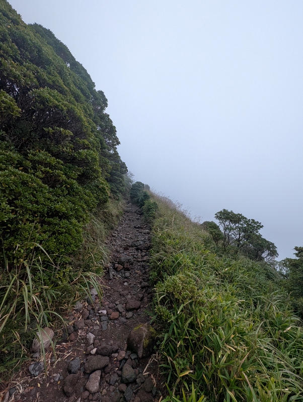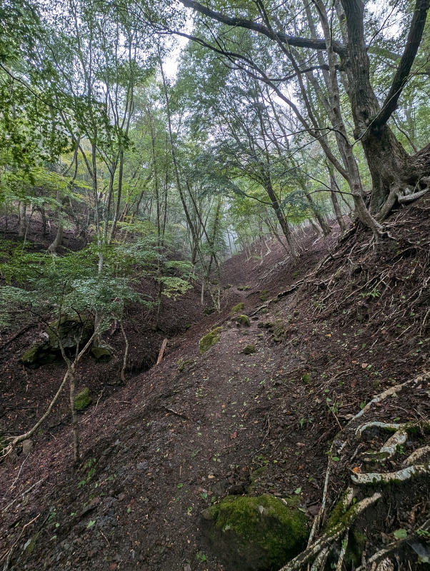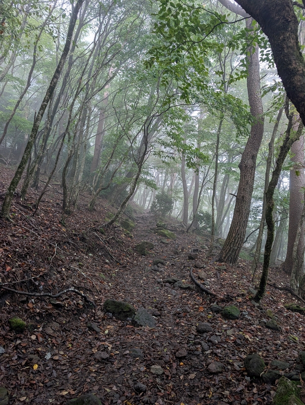 九十九折れも終盤になると直登気味で急登になってくる。晴れてたら急登も苦にならなかったと思うがこれじゃね💦