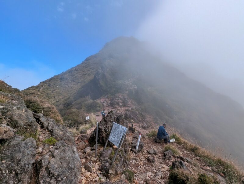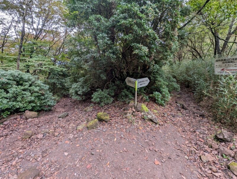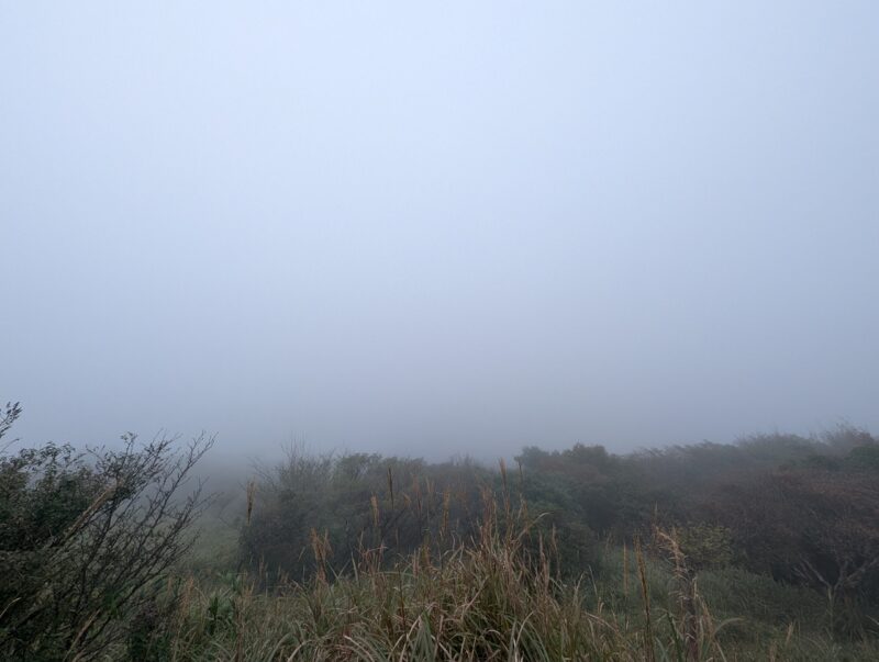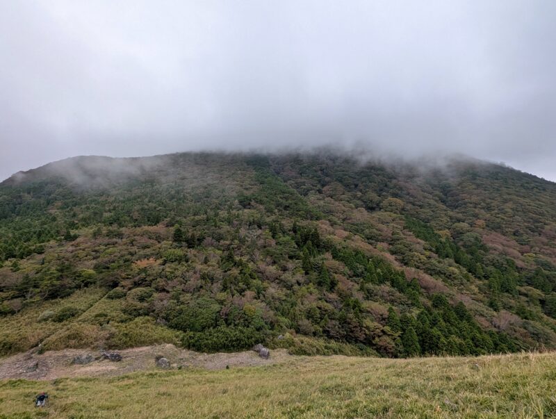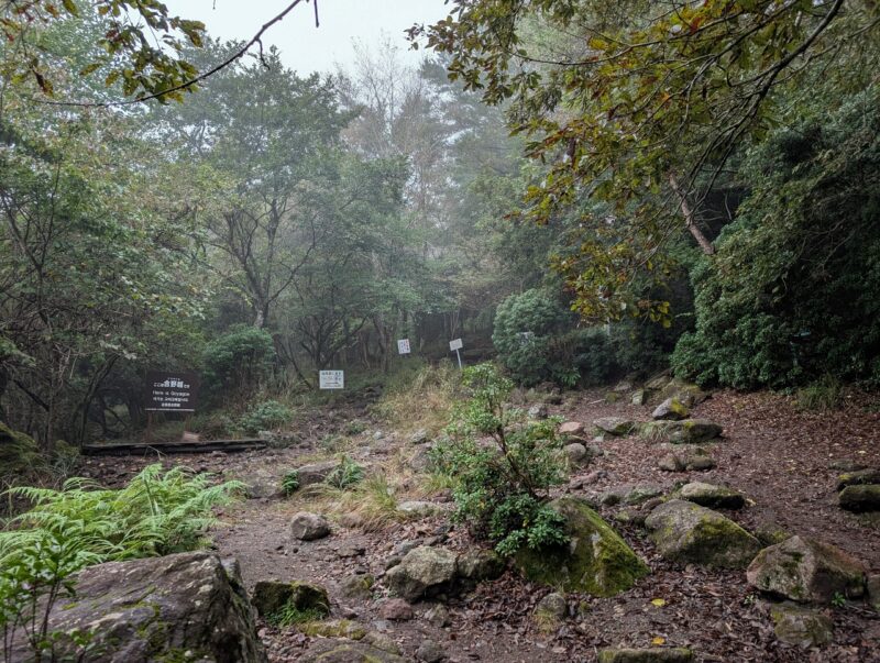 標高900m以上は完全にガスの中。本来だとココから綺麗な山容の由布岳が目の前に見えるんでしょうが。ガスガスで展望のない登山になってしまうでしょうが、とりあえずココまで来たし由布岳山頂を踏んで帰りたいと思います。