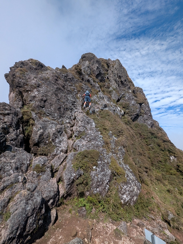 ここがいわゆる西峰への核心部みたいですね。落石を心配してオジサンが登りきるまで待っていた。
