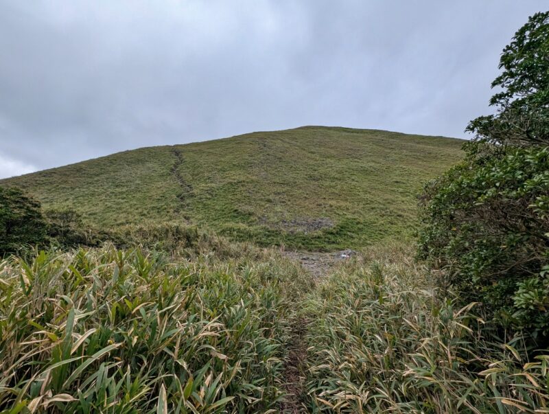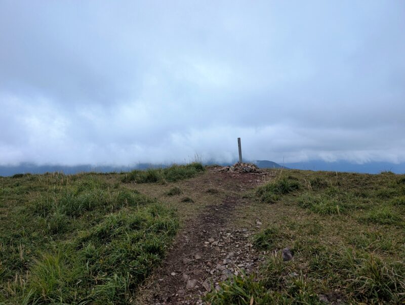 笹道を抜けるといきなり芝の山が出てきてビックリ。ガスって無ければ展望が良さそうだな。