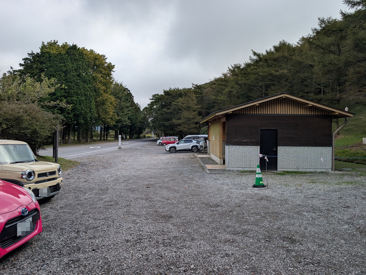 かなりの台数を停めれる駐車場。綺麗なトイレ、水道もあります。自販機はなし。自販機はここから1.5kmほど下った「狭霧台」にあります。