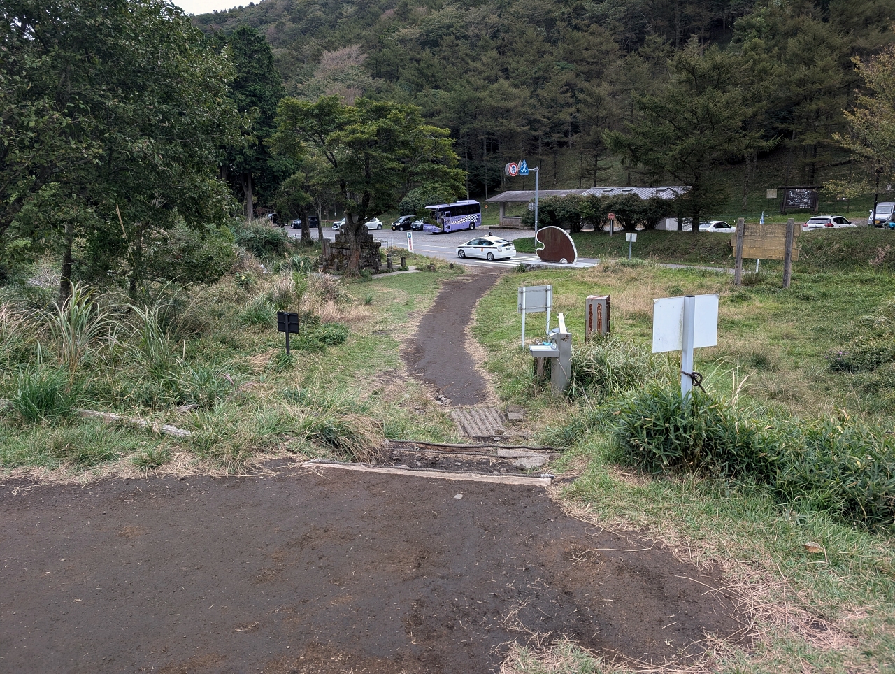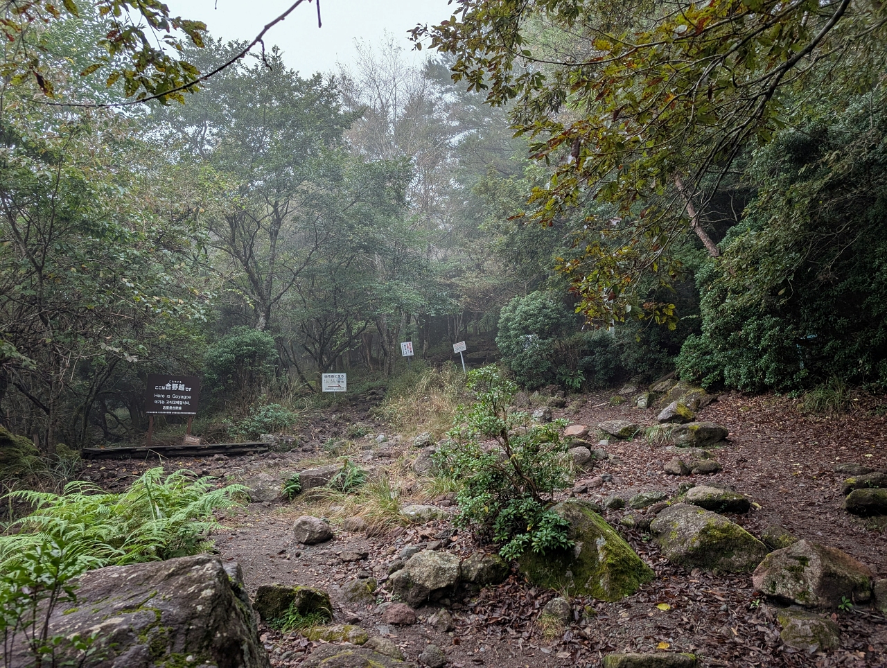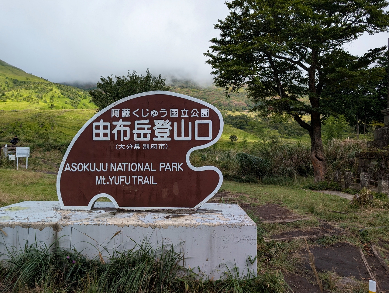 新門司港から下道を走って3時間20分。ようやく由布岳登山口に到着。ガスガスやん😢 こんなん登っても全然オモシロくないやん。展望がウリの山なのに・・・