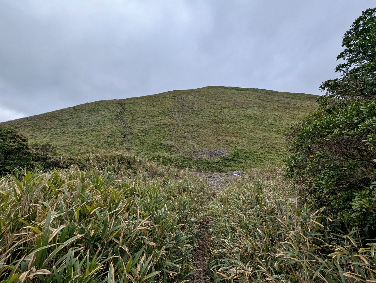 まずは傾斜のゆるい草原の中を気持ちよく歩いて行きます。左を見ると青空も時々見えてます。