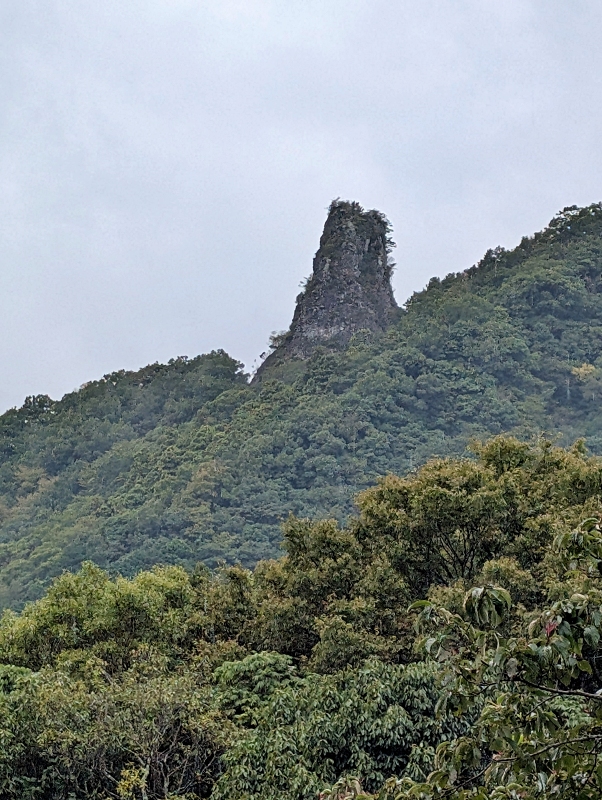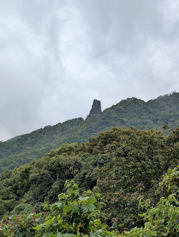 山道を快調に走っていると、目の前の尾根に突如突き出た岩を発見!石鎚山の天柱岩みたいだな。