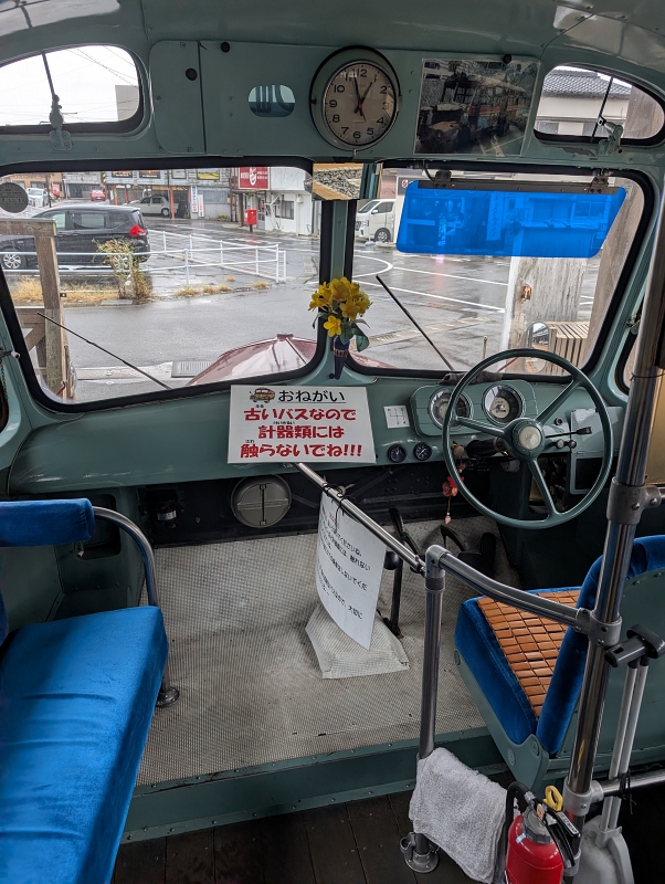展示しているボンネットバスの車内も入ることが出来ます。大きいバスをこんな細いハンドルで運転するのは今じゃ考えられないですね。多分パワステも無い時代の車だと思う。