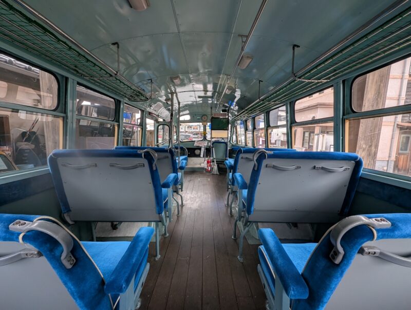 当然ですがエアコンはありません。この時代は降車ボタンも存在しなかったんですね。座り心地は昔のアメ車みたいに柔らかい。サスの硬さをシートの柔らかさでごまかしてたんでしょうかね。