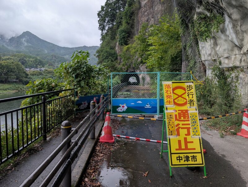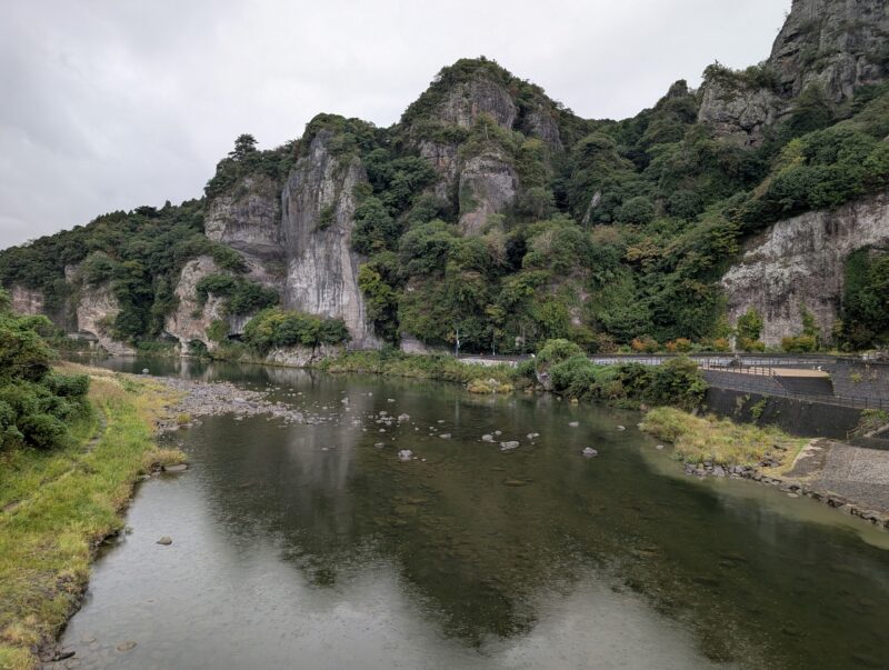 紅葉シーズンだとココから更に奥地の一目八景(ひとめはっけい)特に美しく、多くの観光客が訪れるそうです。今回は雨だし耶馬渓の入口にある青の洞門だけ見てまわろうと思います。