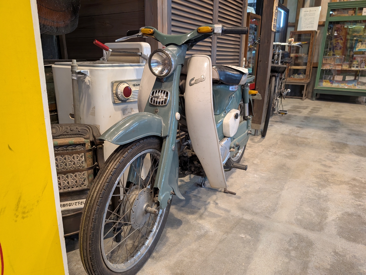 ココに置いてある物のほとんどが、昭和30年代のモノばかりなので、恐らく初代スーパーカブC100だと思う。