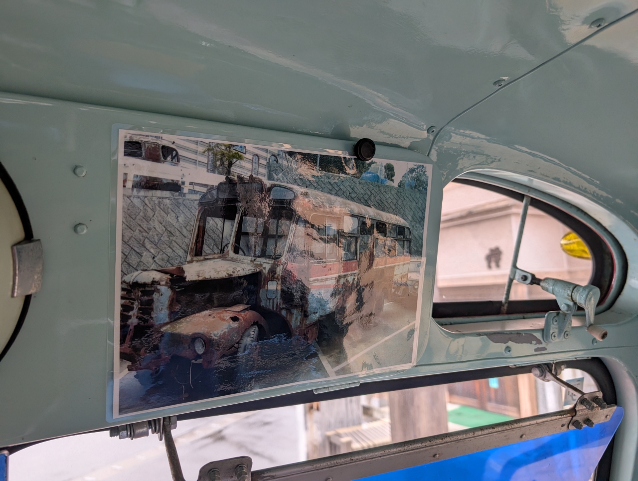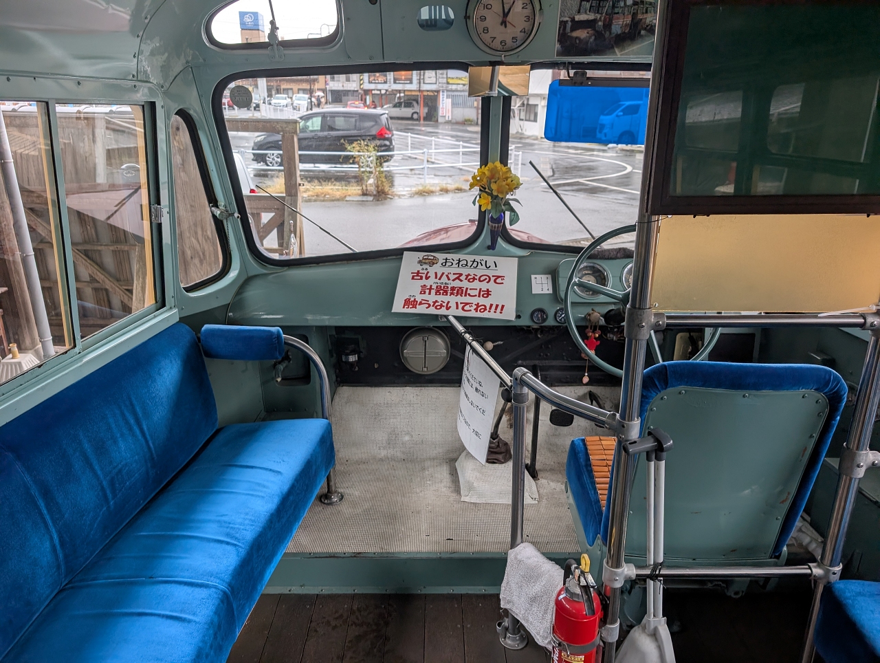 展示しているボンネットバスの車内も入ることが出来ます。大きいバスをこんな細いハンドルで運転するのは今じゃ考えられないですね。多分パワステも無い時代の車だと思う。