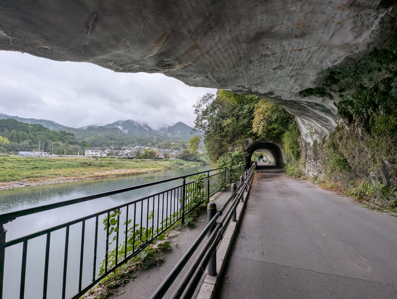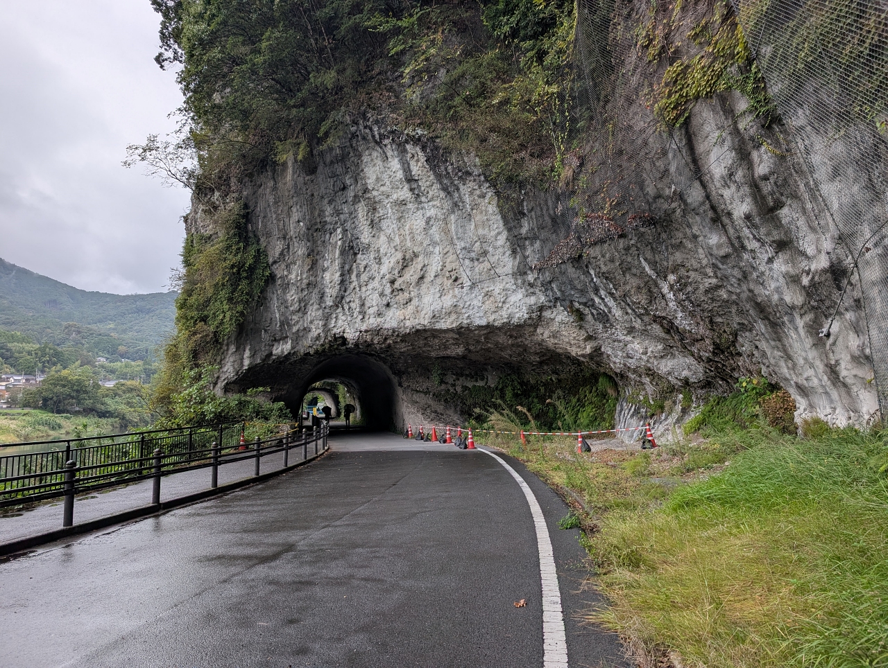 紅葉シーズンだとココから更に奥地の一目八景(ひとめはっけい)特に美しく、多くの観光客が訪れるそうです。今回は雨だし耶馬渓の入口にある青の洞門だけ見てまわろうと思います。