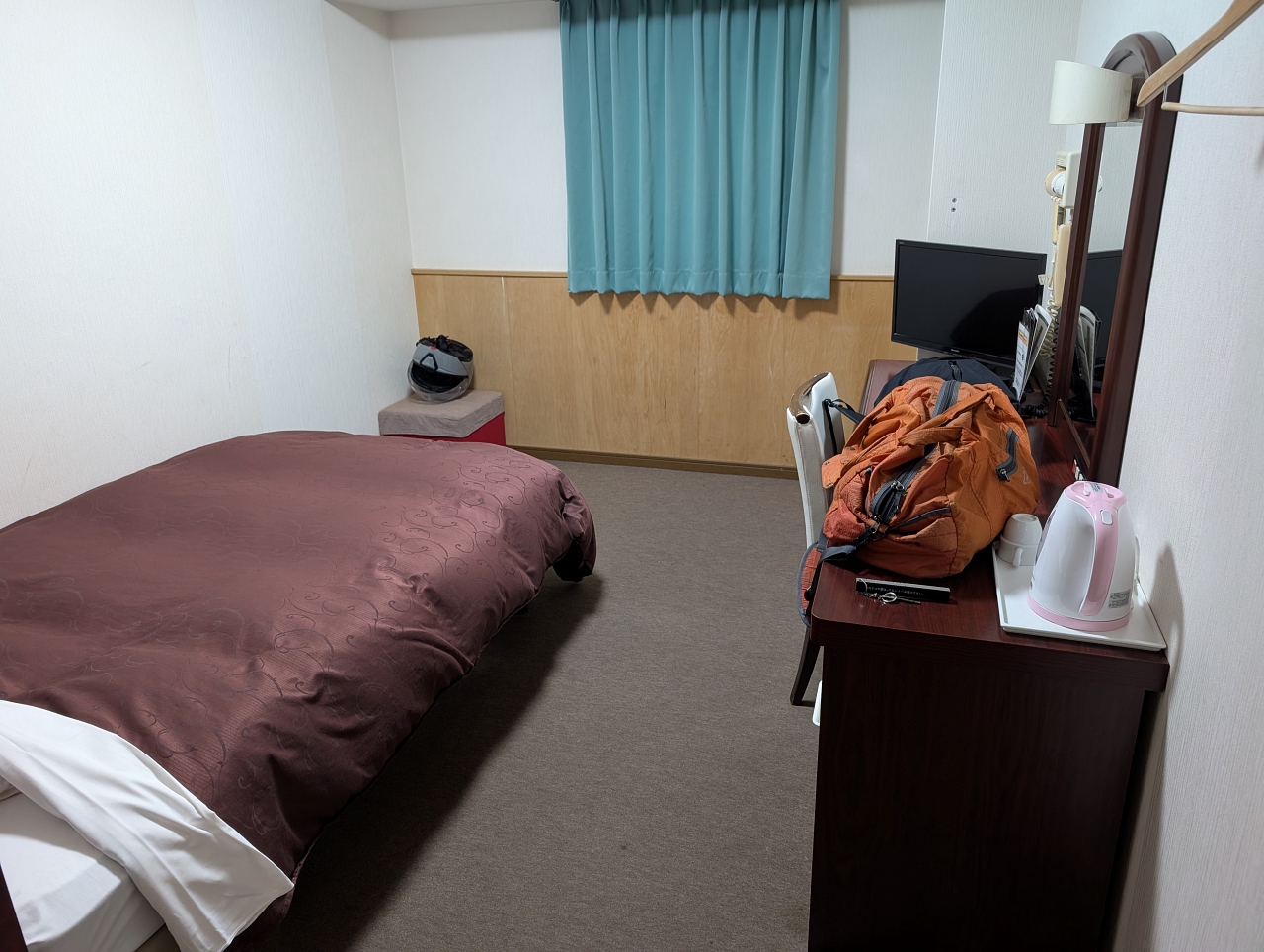 バイクは建物1Fの屋根付きで防犯性も高くバイク乗りには嬉しいホテルです。JR中津駅からも非常に近くてホテル周辺にはいろんなお店があるので、とても便利がいい。それに何より安い。