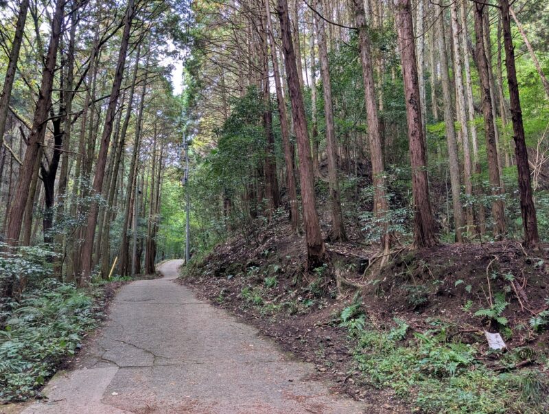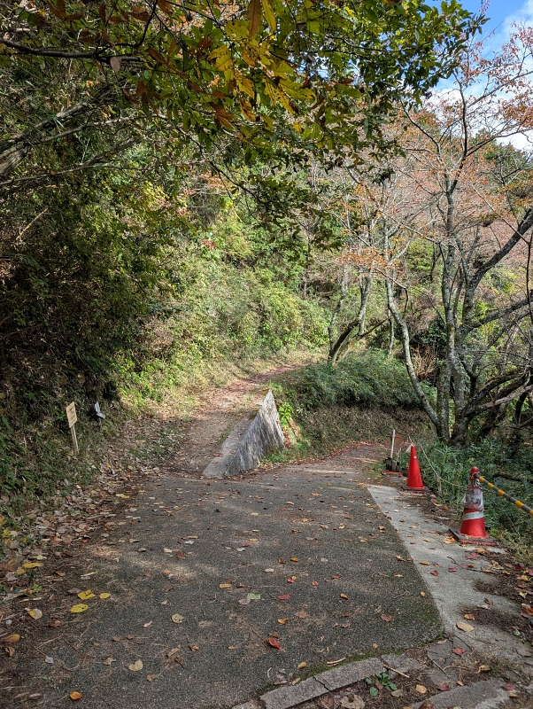 大阪側へ着地。右へ行けば万葉の森駐車場はすぐそこ。ここを左に曲がって登り返す。