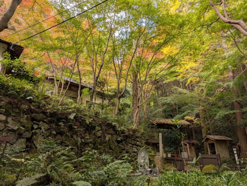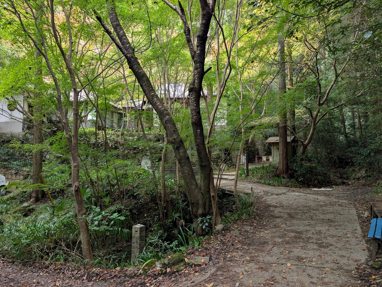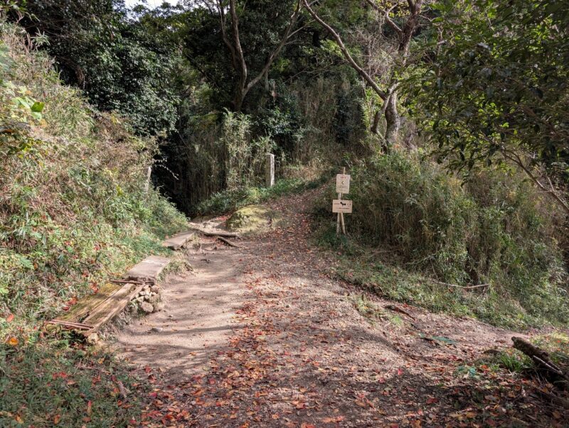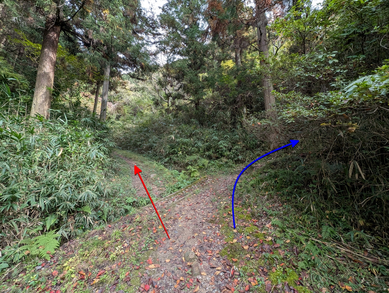 右(青線)は以前歩いた事がある。登って行けば鹿谷寺跡に出るコースだ。左(赤線)は初めてのコースなので、赤線を進むことにした。赤線を進んでも登った先は青線と合流します。どの辺で合流するのか楽しみだ。