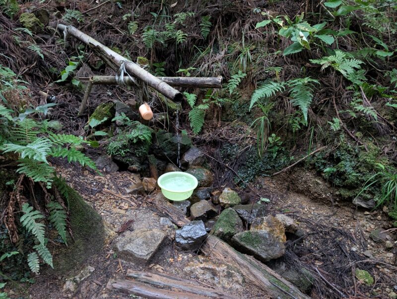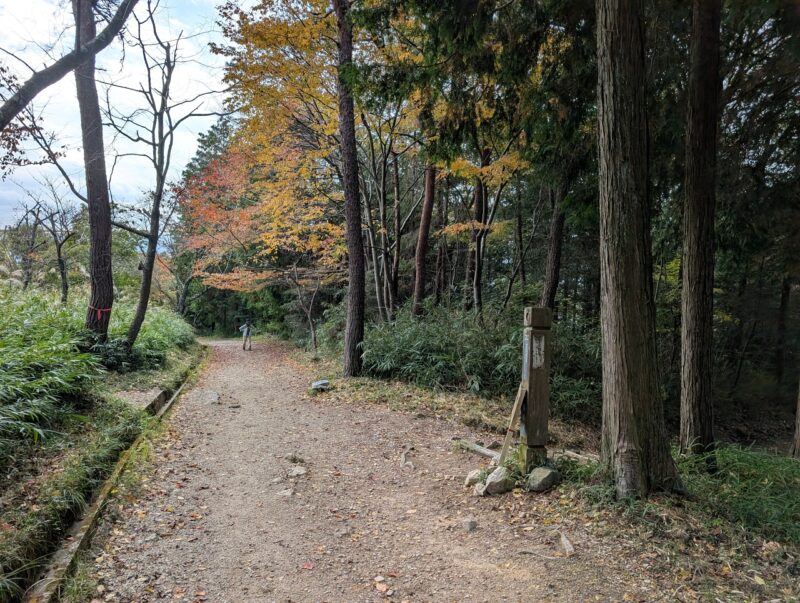 ダイトレに出ました。左へ行けば山頂方面です。岩屋峠は右へ行きます。その前に立派なベンチに座って最後の休憩。