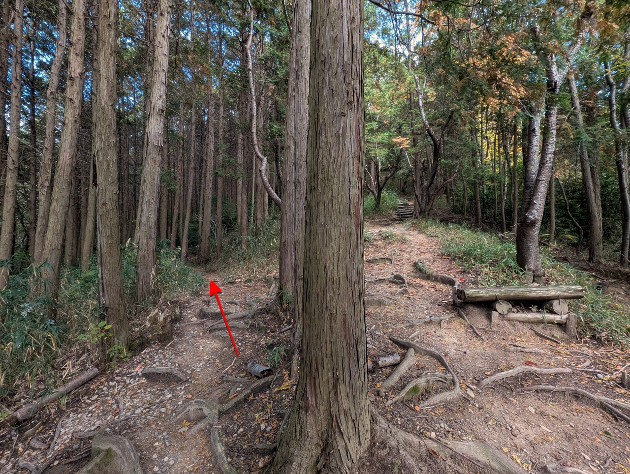 真っすぐ進んだ方が早いんだけど、左(赤線)の方に進みました。赤線は少し距離が長くなるけど、傾斜のゆるい道です。どちらの道もダイトレに出る直前で合流する。