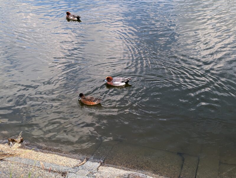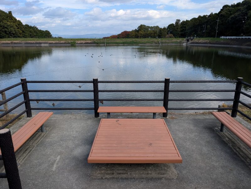 立派なベンチがあります。ココに近づいただけでカモたちが急いで寄ってくる。みんな餌付けしてるんだろうな。