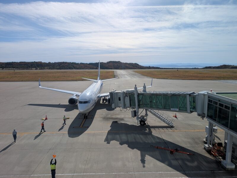 ちょうど羽田から到着機がやって来ました。この機には経済産業大臣の赤澤大臣が乗っていた。通路を通る姿は見えましたが、その後は一般客が出る出口では無く、別の出口から出て行かれたので間近で見ることは出来なかった。残念・・・