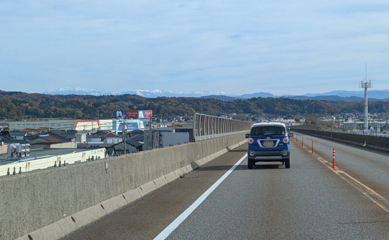 まだ昼過ぎなので、金沢市内を見学しても良かったんだけど、みんな疲れていたので今回はそのまま帰阪しました。前方に真っ白な北アルプスがハッキリと見えてます。