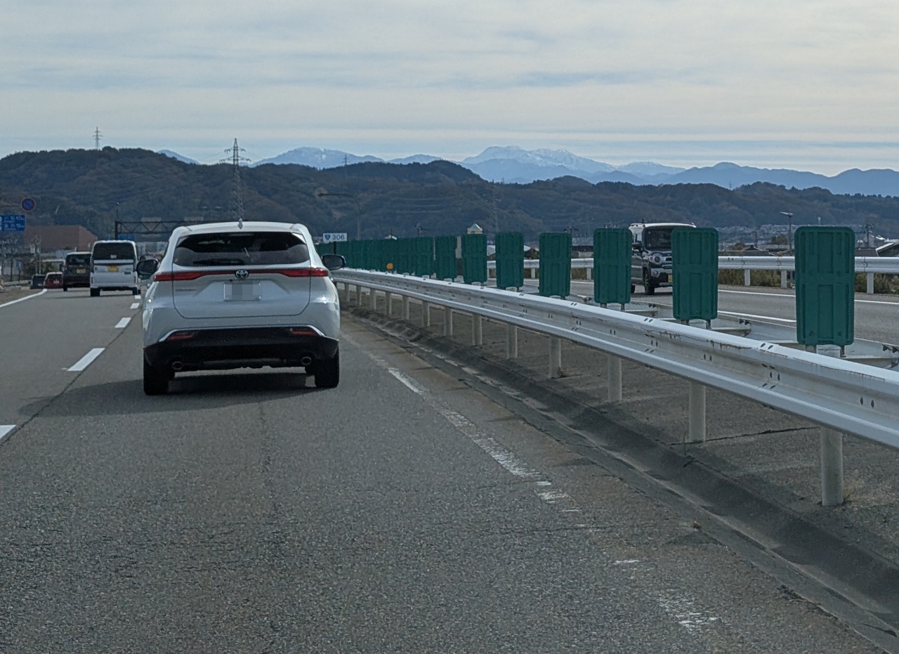 まだ昼過ぎなので、金沢市内を見学しても良かったんだけど、みんな疲れていたので今回はそのまま帰阪しました。前方に真っ白な北アルプスがハッキリと見えてます。