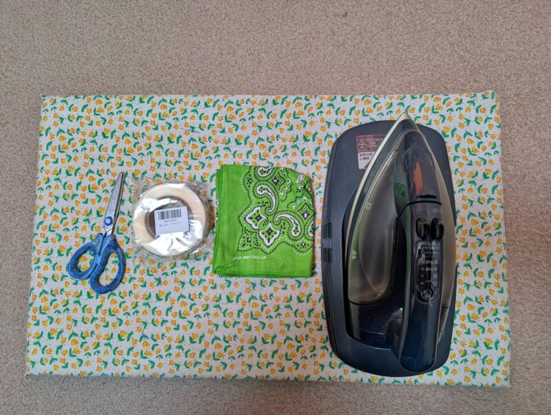 シームテープは幅25mm×30mを用意しました。元のシームテープも25㎜幅のテープでした。あとはハサミ、アイロン台、写真には写っていませんが、元のテープを剥がした後を拭くためにアルコールを用意しました。