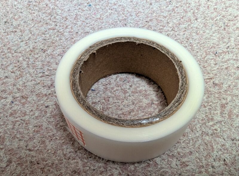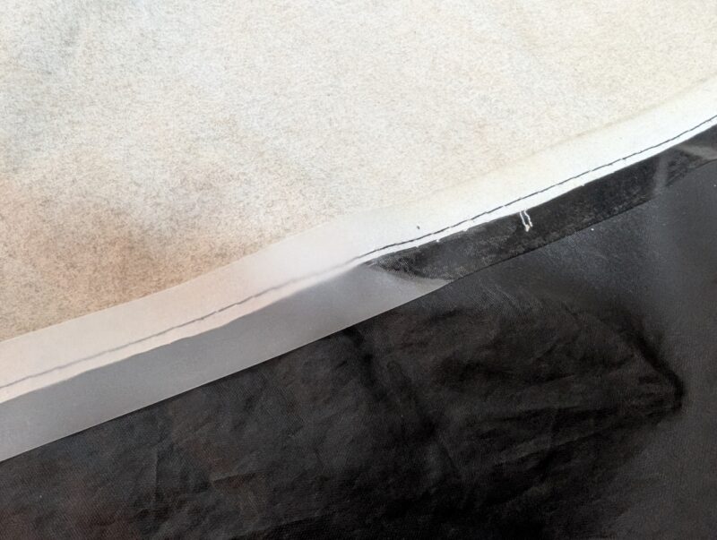 アイロンは中で使用。最初はあて布を使っていましたが、弱かったのと生地が厚めなので、直接アイロンしました。完全に接着できるとテープは透明(右側)になる。空気が入っている場合はアイロンの先を使ってもう一度加熱します。決してアイロンでグリグリ押さえつけないこと。グリグリ押さえつけるとテープは簡単に破れたり切れたりします。 そっと上から押さえつける感じで。